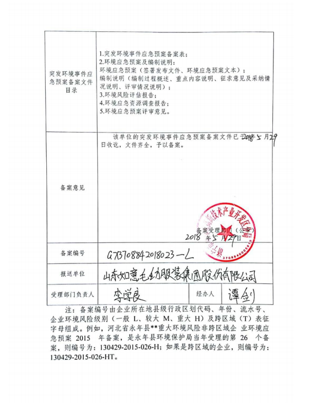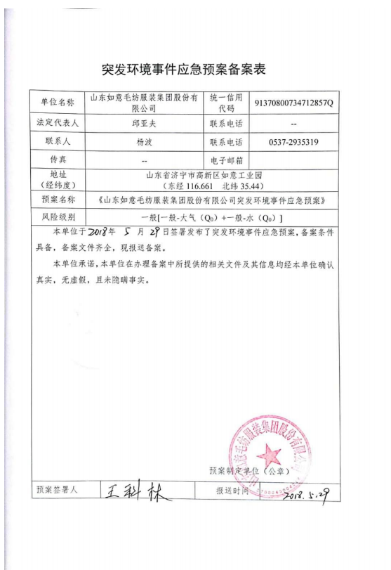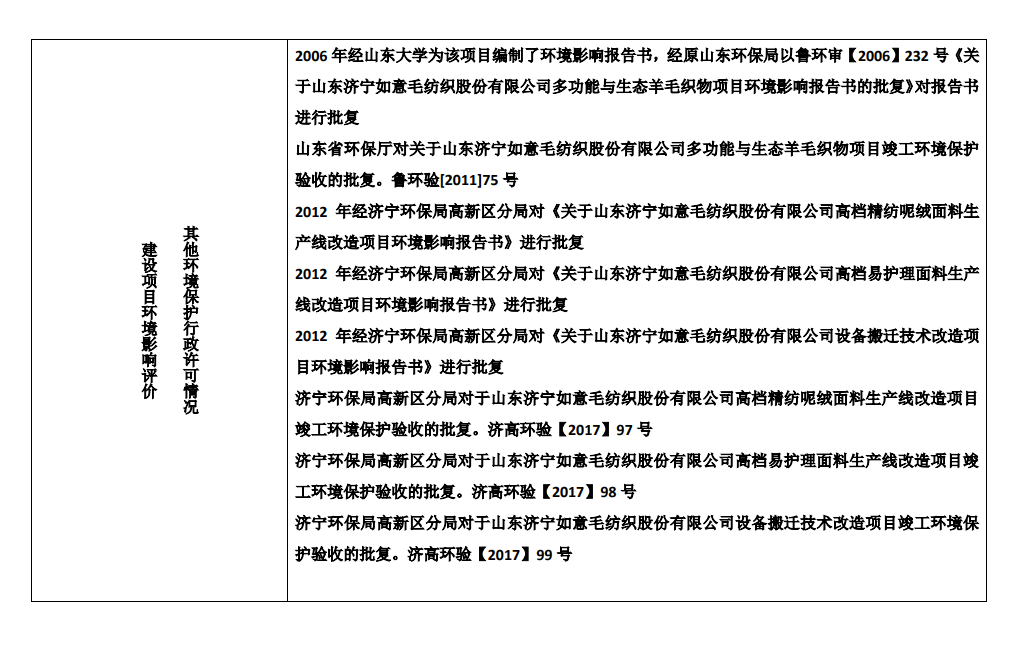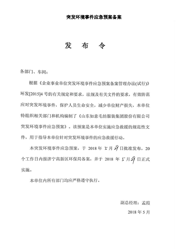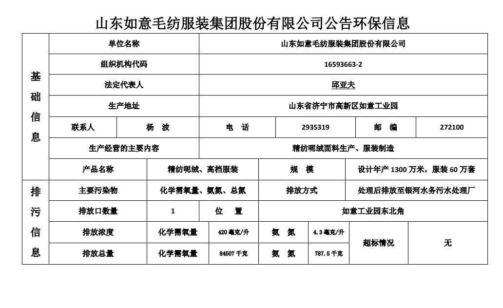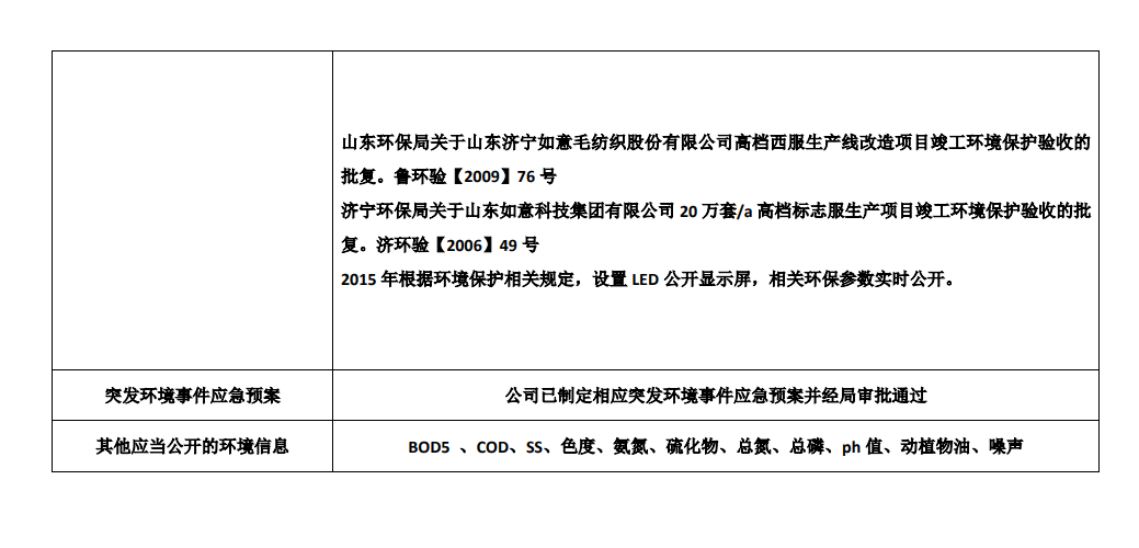 山東如意毛紡服裝集團(tuán)股份有限公司公告環(huán)保信息